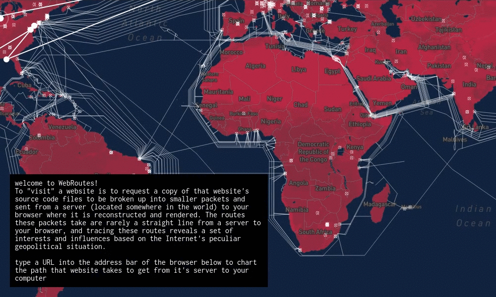 WebRoutes provides a viewer with a window into the internet infrastructure and geopolitical network topology that is inherently invisible to them as they browse the web. By visualizing an augmented traceroute process, WebRoutes identifies the Autonomous Networks (AS), ISPs, Internet Exchange Point (IXP) crossings, and Submarine Cables that work together to ping-pong TCP/IP packets back and forth from their web browsers to servers. By elongating a process that usually takes milliseconds, our installation allows the viewer to follow, analyze, and draw conclusions about the intricate, often counter-intuitive, paths their packets take on their journey through the Internet.