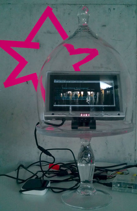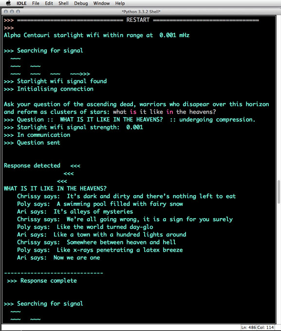 Awry Signals: A Eulogy for the Stellar [Girls] is code séance performance installation, a device to tap into a starlight WIFI beam in order to receive messages from the three stellar punks now making their way along it to the heavens; they shine up the cathedrals of light in the night sky.