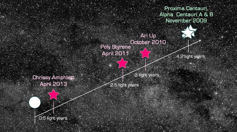 In some belief systems it is said that deceased warriors first disappear beyond all visible horizons and then reappear in the firmament as multitudinous star clusters. Some of the stars nearest to earth are in Alpha Centauri, a binary system composed of Alpha Centauri A and B, close to a third star, Proxima Centauri. Alpha Centauri is 4.3650 light-years away, while Proxima Centauri is 4.241 light-years away. We need this level of detail because we can see how in the firmament the past is visible in the light of the stars and the present is delayed by distance. Light transmission comes to us at 300,000 kilometres per second, traversing the cosmos to show us something that once was, but is no longer a living reality. Recent years have seen the deaths of these three great women who have inspired us during their lives: Ari Up of the Slits (deceased October 2010), Poly Styrene of X-Ray Spex (deceased April 2011), and Chrissy Amphlett of the Divinyls (deceased April 2013). Therefore, it is our calculation that some of the light we see in the night sky comes to us from a time when all three were still alive. A direct beam of starlight Wi-Fi is now passing back through their last days, deaths and afterlives.
